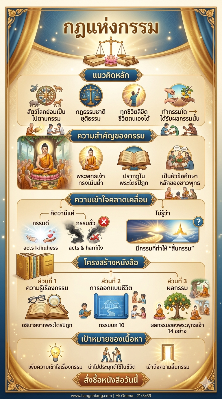 ซึ่งเนื้อหาทั้งหมดจะช่วยให้ผู้อ่านมีความรู้ความเข้าใจในกฎแห่งกรรมมากยิ่งขึ้น และสามารถนำไปต่อยอดการปฏิบัติจนเข้าถึงความสิ้นกรรมในที่สุด